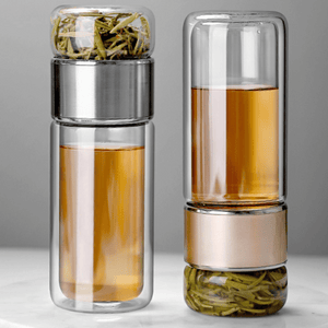 Stiklinė gertuvė arbatai plikyti su arbatžolių atskyrimo sieteliu. Skaninkite vandenį arbata.